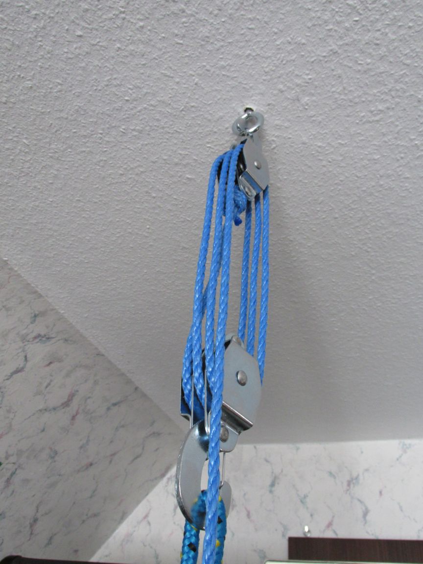 Respekt!Dann habe ich noch 'ner bekloppten Idee freien Lauf gelassen und eine Öse in einen Deckenbalken geschraubt und zwar für das da,